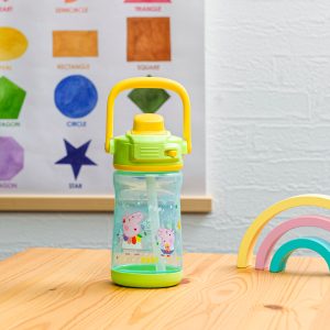 Whether it’s a school day. a playdate. or an exciting weekend adventure. the 12oz Peppa Pig Beacon Water Bottle from zak! is the perfect companion for keeping little ones hydrated. Made from sturdy. BPA-free plastic. it’s built to withstand the bumps and scrapes of an active lifestyle while ensuring safety and durability. The soft silicone spout is gentle and comfortable. and a flip-up protective cover opens with the push of a button. making it easy for kids to sip on the go. The spout locks securely to prevent leaks. and the non-skid base helps keep the bottle steady and absorbs impact to protect it from damage. Sized to fit in most car cup holders and equipped with a convenient carrying handle. this bottle is designed for grab-and-go convenience. When the adventure ends. simply toss it on the top rack of the dishwasher for a hassle-free cleanup. Featuring a fun design that adds a splash of joy to every sip. this reusable bottle is sure to make staying hydrated a highlight of your child’s day!