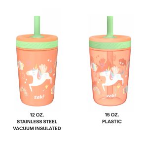 Let’s keep it simple: these Unicorn tumblers don’t leak. The silicone sipper spout design has a built-in valve that stops water from flowing when no one is drinking: it’s easy for children to quench their thirst. but won’t make a mess if the tumbler is tipped over. It’s the perfect choice for active kids. or young ones just graduating from sippy cups who aren’t ready for an open-topped tumbler yet. Two tumblers and a bonus sipper are included in the set??the 12-ounce stainless steel tumbler has vacuum insulation. which keeps drinks cold and eliminates water rings from condensation. and the 15-ounce plastic tumbler is lightweight and easy to carry. They’re both durable. reusable. and completely BPA free.